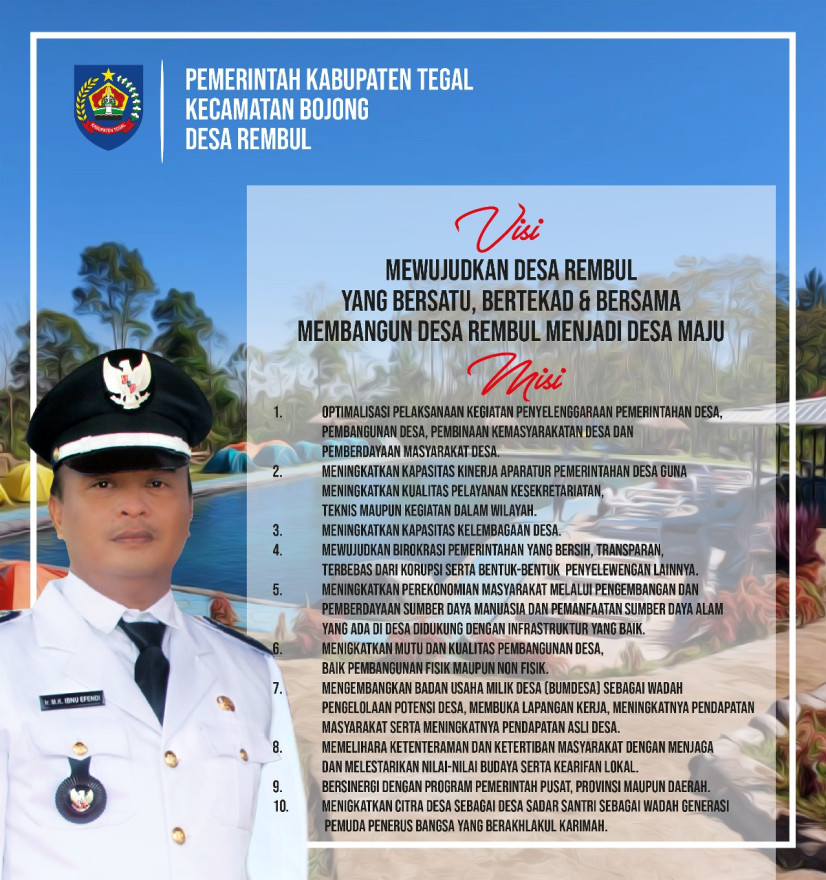 Misi merupakan sesuatu yang diemban atau dilaksanakan oleh Desa Rembul untuk mencapai Visi yang telah ditetapkan agar tujuan dapat terlaksana dan berhasil dengan baik sesuai yang diharapkan.