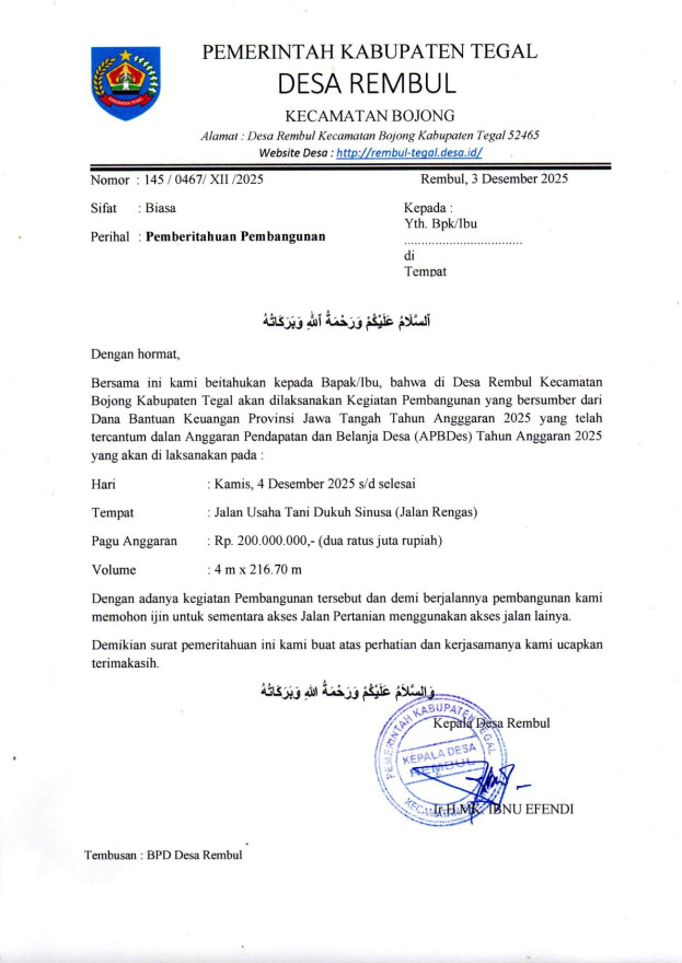 Surat Pemberitahuan Pembangunan Pengaspalan Jalan Usaha Tani Dukuh Sinusa Desa Rembul